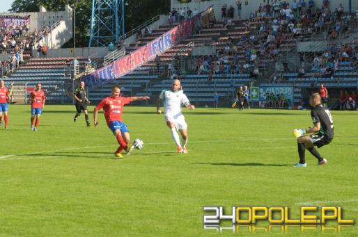 Mecz 34., ostatniej kolejki 2. Ligi Zachodniej w Opolu ze zdecydowanie większą inicjatywą rozpoczęli goście. Ekipa Mirosława Smyły kilkoma groźnymi akcjami po skrzydłach próbowała rozmontować defensywę Odry i przyniosło to skutek w okolicy 10. minuty. Właśnie wtedy po strzale głową z bliskiej odległości do interwencji zmuszony został Maciej Krakowiak. Warto w tym miejscu wyjaśnić, że o dokładny pomiar czasu tego dnia przy Oleskiej nie było łatwo, bo awarii uległa tablica informacyjna na stadionie.
