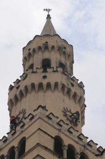 Grupa alpinistów podczas prac konserwacyjnych na wieży opolskiego ratusza.