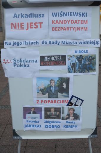 Osobną konferencję prasową zwołał Grzegorz Zwolak z młodzieżówki SLD, by poinformować o tym, że Arkadiusz Wiśniewski wcale nie jest bezpartyjny. - Wiśniewski pokazuje się jako kandydat bezpartyjny, a przecież stoi za nim Solidarna Polska, Młodzież Wszechpolska i kibole, których ma u siebie na liście - mówi Zwolak.