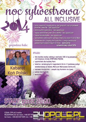 Już od 20:00 w sylwestrową noc 31 grudnia będzie Was bawił kabaret Koń Polski, który będzie gospodarzem balu. Doskonałe poczucie humoru i świetna zabawa gwarantowana, bo mottem kabaretu Koń Polski jest: MINUTA ŚMIECHU TO DZIEŃ ŻYCIA DŁUŻEJ!