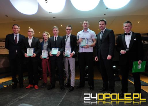 Trzej nagrodzeni w plebiscycie Sportowiec Roku i rektor Politechniki Opolskiej prof. Marek Tukiendorf.
