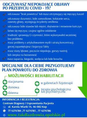 Urząd Marszałkowski Województwa Opolskiego w trosce o zdrowie mieszkańców województwa, wraz ze Stobrawskim Centrum Medycznym w Kup, Opolskim Centrum Rehabilitacji w Korfantowie i Centrum Terapii Nerwic w Mosznej, realizuje unijny pilotażowy projekt pn. "Rehabilitacja osób z deficytami zdrowotnymi wywołanymi przez COVID-19 w województwie opolskim".