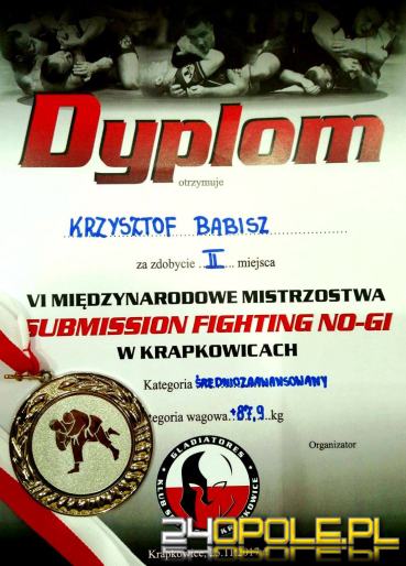 Pod koniec października w Krapkowicach odbyły się VI Międzynarodowe Mistrzostwa Submission Fighting w brazylijskim Jiu-jitsu w formule "no-gi". W turnieju wystartowało blisko 100 zawodników. W gronie startujących znalazł się aspirant Krzysztof Babisz - na co dzień przewodnik psa służbowego z Komendy Powiatowej Policji w Prudniku.