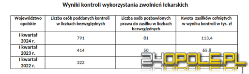 - W pierwszym kwartale tego roku opolski ZUS pozbawił prawa do zasiłku chorobowego 81 osób z 791 poddanych kontroli pod kątem prawidłowości wykorzystania zwolnienia chorobowego. Kwota cofniętych bądź wstrzymanych świadczeń sięgnęła ponad 113 tysięcy złotych, co jest najwyższą kwotą od kilku lat - informuje Sebastian Szczurek, regionalny rzecznik prasowy ZUS województwa opolskiego.