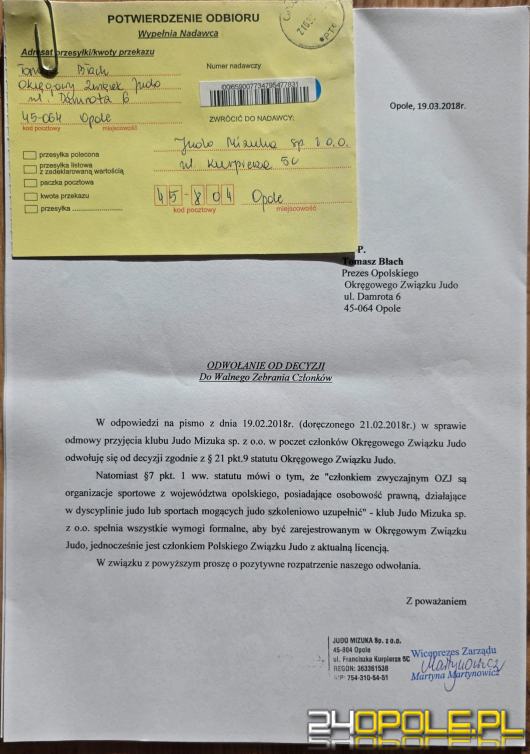 Tomasz Hryniewicz, prezes Mizuka Judo Opole, potwierdza, że od dekady klub regularnie składa wnioski o przyjęcie do OZJO.