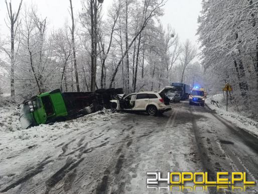 Zderzenie osobówki z ciężarówką na DW 408. Droga zablokowana