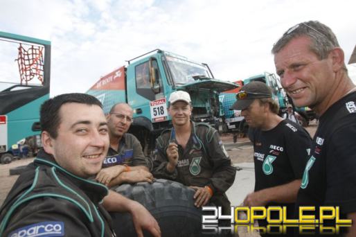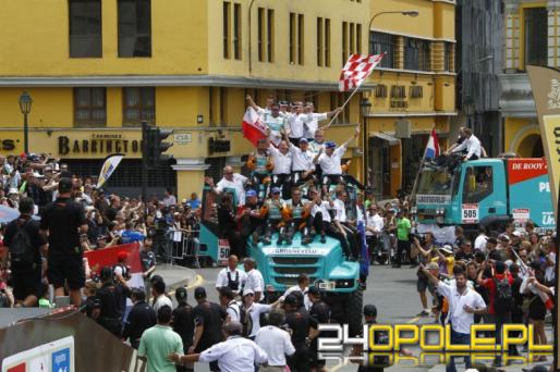 Dariusz Rodewald, pochodzący z Olesna, wygrał tegoroczny Rajd Dakar w kategorii ciężarówek. Na zdjęciu, podczas rundy honorowej, trzyma polską flagę.